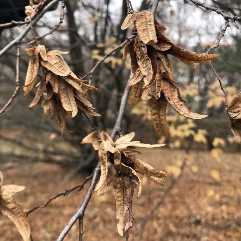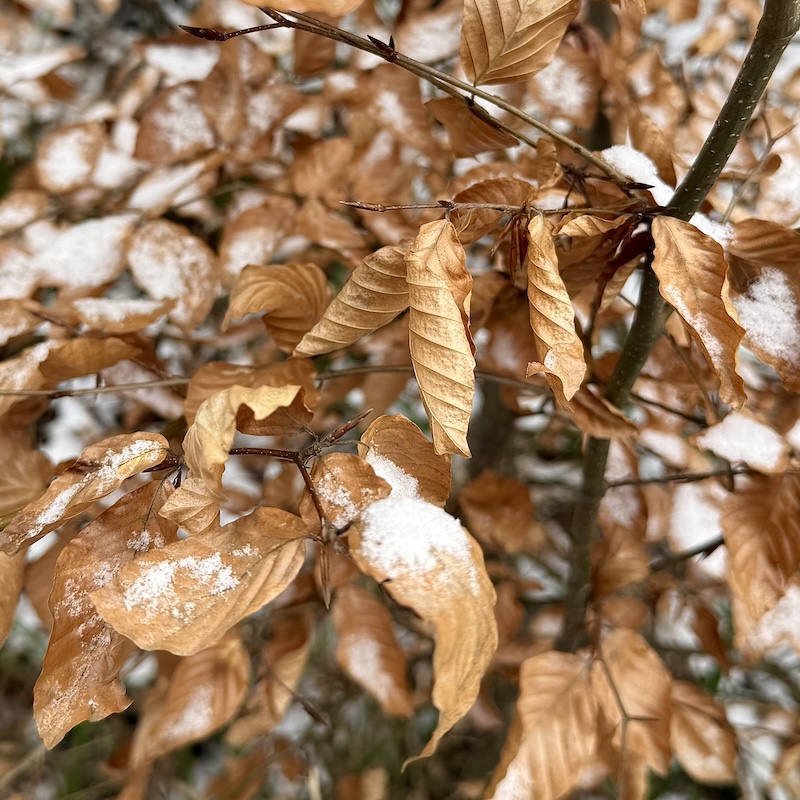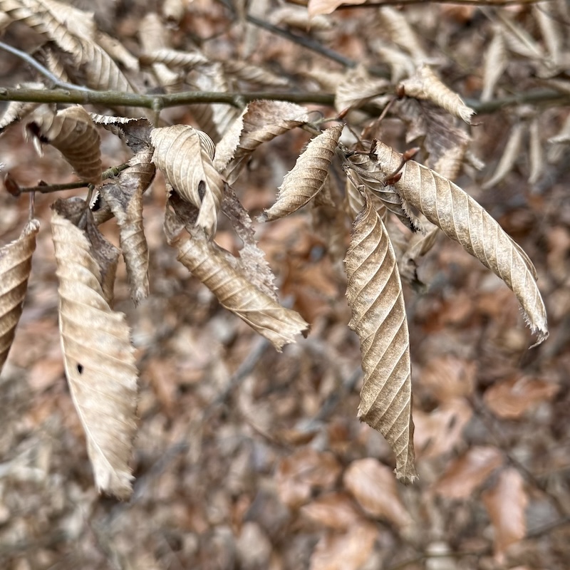 Junge Hainbuchen behalten im Winter den Großteil ihrer Blätter, die vertrocknet graubraun gefärbt und stärker eingerollt sind als bei der Rotbuche.