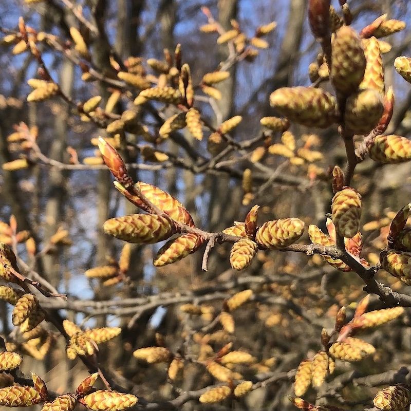 Männliche Blüten: Kätzchen: herabhängende Kätzchen (4-7 cm lang) erscheinen kurz vor dem Blattaustrieb.