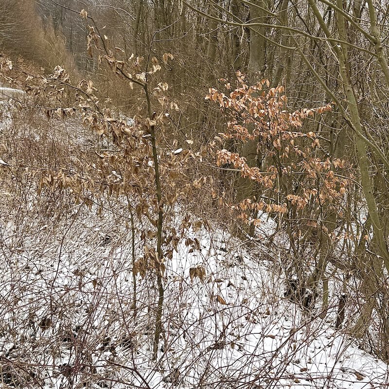 Junge Rotbuche behalten im Winter einen Teil ihrer Blätter, die vertrocknet rotbraun gefärbt sind.