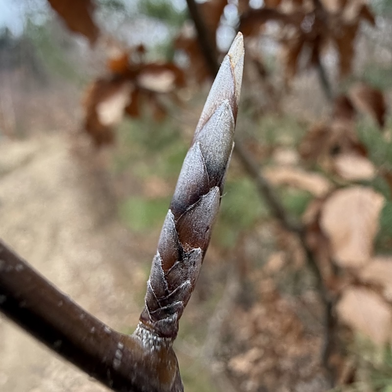 Aufbau und Form der Knospen: vom Zweig abstehende, auffallend lange, spindelförmige Knospen, am Ende zugespitzt, in der Mitte